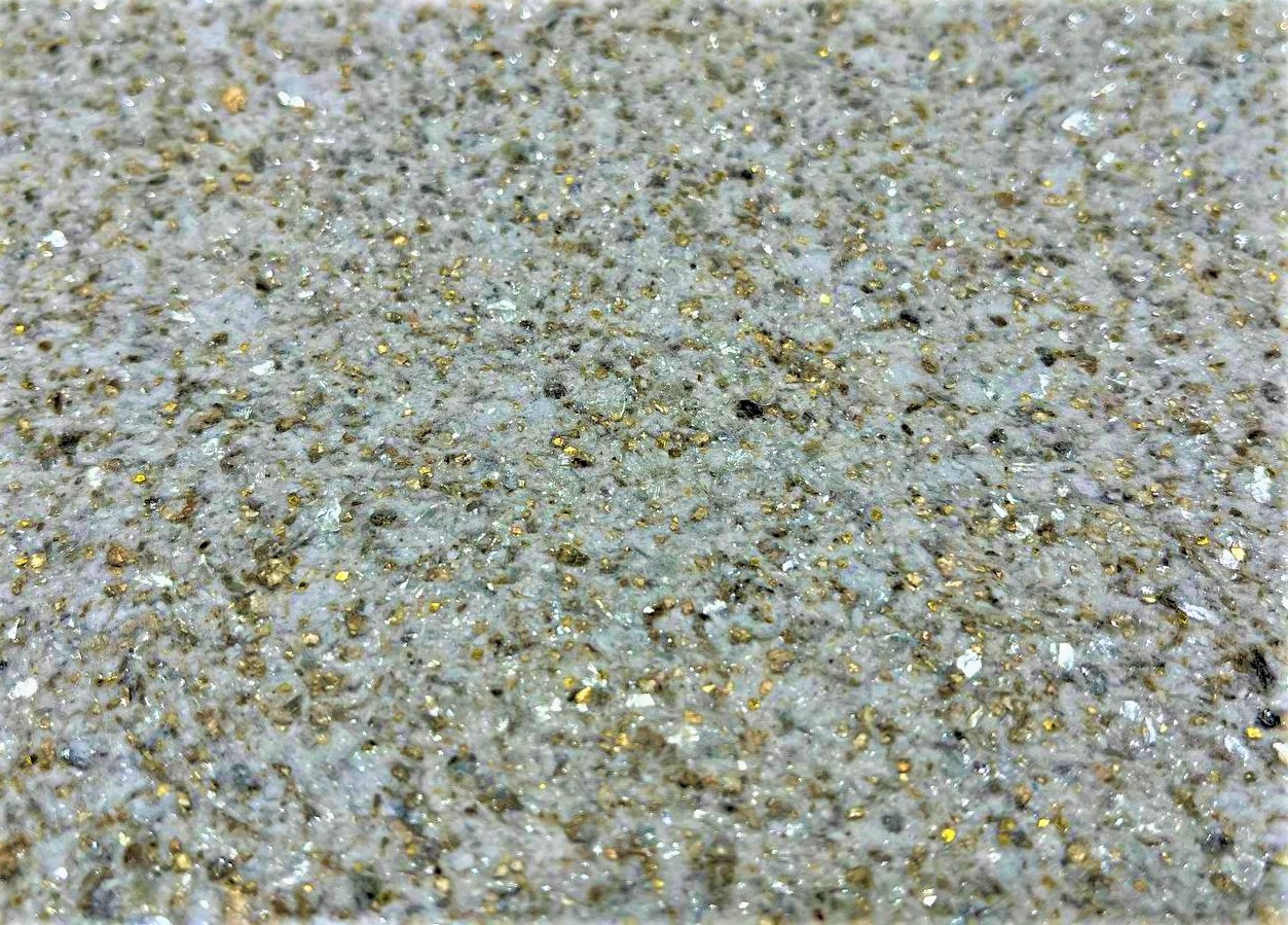 Feito a partir de fibra de algodão, minerais nobres e brilho de composto acrílico metalizado.