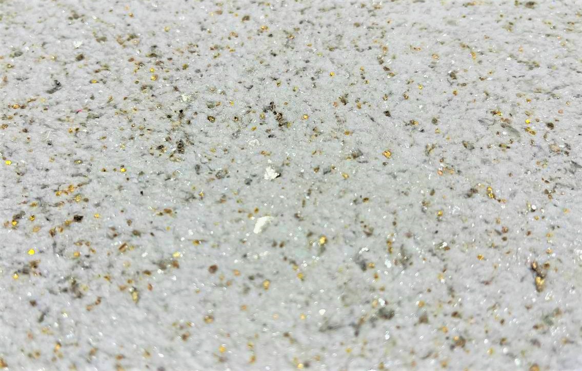 Feito a partir de fibra de algodão, minerais nobres e brilho de composto acrílico metalizado.